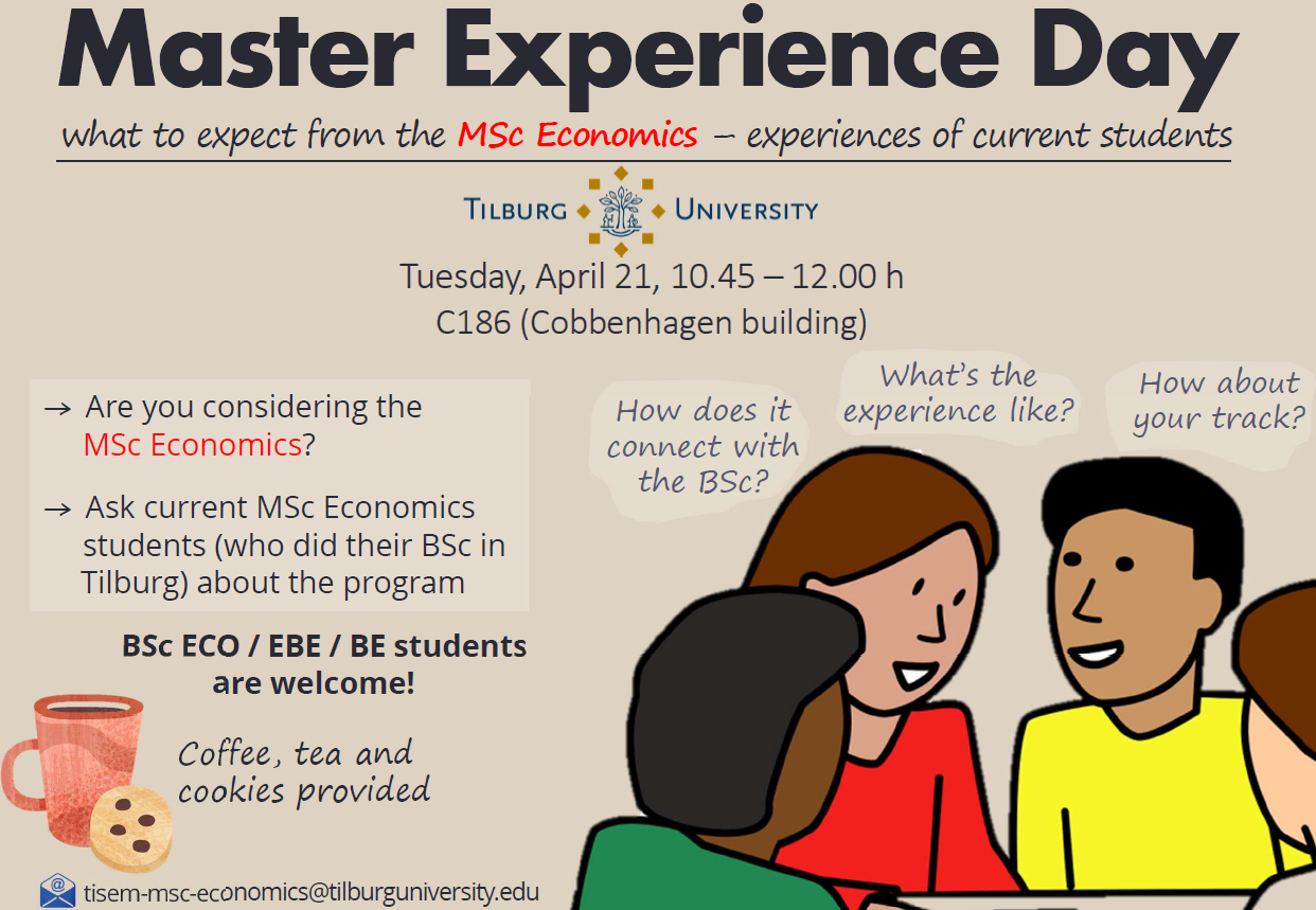 If you don't know yet which master you want to follow, visit the Master Experience Session of the Master Economics.Get more insight into the content of the Master Economics by talking to current students of the program in the meantime enjoying a snack.